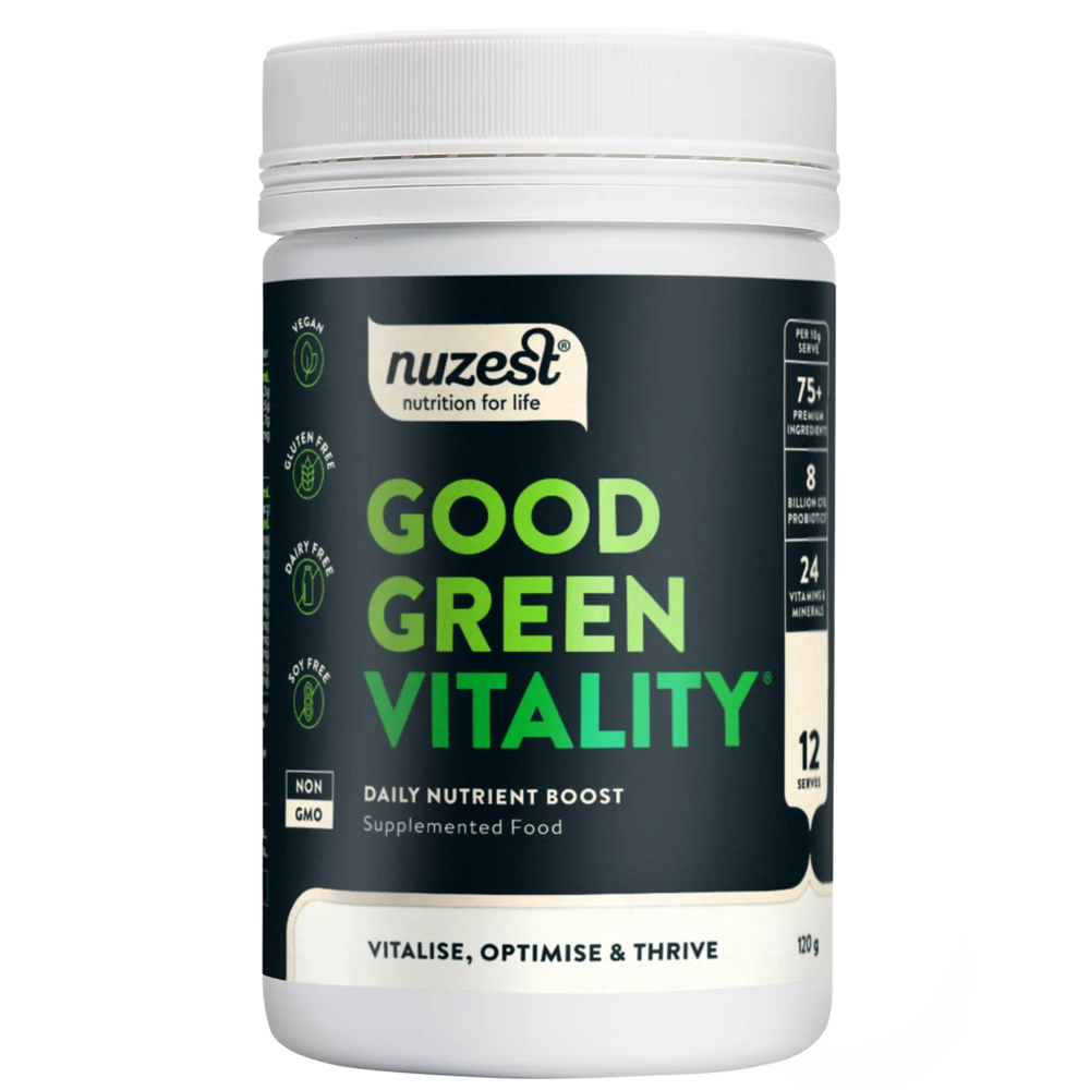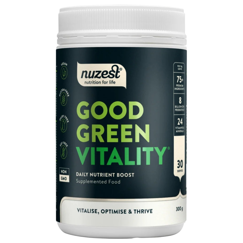 Nuzest Good Green Vitality is a nutrient-dense, plant-based superblend designed to support all aspects of daily health and wellbeing. With over 75 wholefood ingredients including greens, fruits, herbs, adaptogens, and digestive support compounds, it provides a practical and bioavailable alternative to multivitamins. Free from gluten, dairy, and artificial ingredients, this powder is a simple way to help meet your nutritional needs, even on the busiest days.